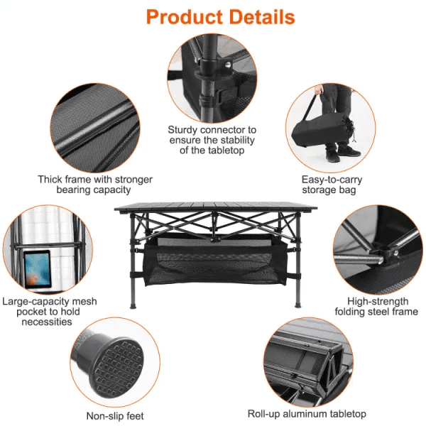 *Premium Material*:Adopting aluminum tabletop and steel frame with anti-slip textured feet,this roll-up table is lightweight,stain-resistant,heat-resistant,rust-free,stable,and easy to clean. Moreover,the tabletop is sturdy enough to withstand a huge amount of food up to 220lbs and large enough to accommodate 4 people.