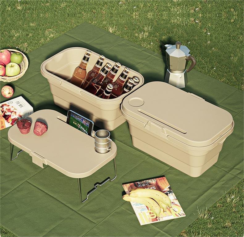 This is an outdoor camping folding storage box picnic waterproof picnic basket.Material: PP + TPRColor: Gray, coffee colorSize: 46.5 * 22.7 * 23.51. Folding does not take up space2. Multiple uses